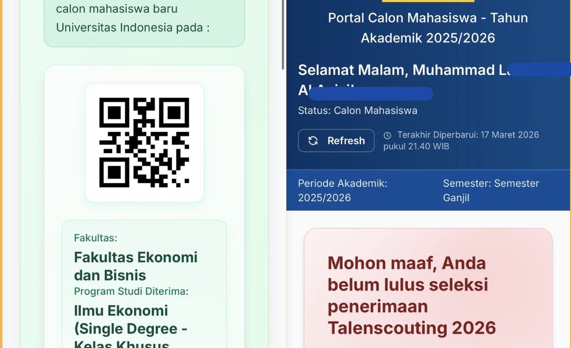 “Anak kami dinyatakan diterima sebagai calon mahasiswa UI jalur Talent Scouting 2026. Suasana berubah menjadi haru, banyak yang bersujud syukur, dan keluarga merayakan dengan penuh kebahagiaan,” tulisnya.